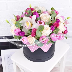 Дамский каприз - коробка с орхидеей и тюльпанами