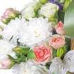 ЛЮКС: хризантема кустовая белая - 5 шт., роза кустовая белая - 4 шт., роза кустовая розовая - 5 шт., эустома белая - 3 шт., альстромерия белая - 5 шт., декоративная зелень, оазис, корзина средняя.