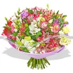 ДЕЛЮКС: эустома розовая - 6 шт., эустома фиолетовая - 6 шт., эустома белая - 5 шт., альстромерия розовая - 11 шт., альстромерия белая - 5 шт.,фетр светло-фиолетовый. Примерный диаметр букета 50х50 см.