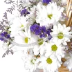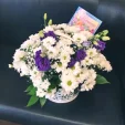 Уменьшенный: хризантема белая кустовая ромашковидная - 5 шт., статица - 3 шт., декоративная зелень, оазис, корзина малая.