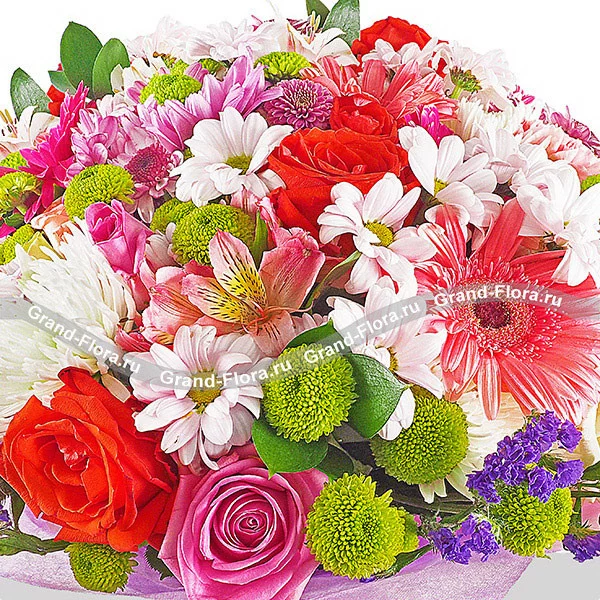 Стандартный (на фото): роза розовая - 3 шт, роза белая - 3 шт, роза красная - 5 шт, гербера розовая - 2 шт, гербера малиновая - 3 шт, хризантема кустовая (белая и розовая) - 5 шт, хризантема кустовая зеленая - 2 шт, хризантема одноголовая белая - 2 шт, альстромерия (белая и розовая) - 2 шт, статица - 1 шт, фетр фиолетовый, мишка до 20 см.