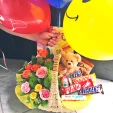 Уменьшенный: роза (микс) - 3 шт., хризантема (зеленая) - 1 шт( возможна замена на хризантему другого цвета), декоративная зелень, оазис, корзина малая, желтый фетр, розово-зеленый бант, мишка "Teddy" (возможна замена на плюшевого мишку)- 1 шт., коробка конфет "Alpen Gold" (163 г.) - 1 шт., Яйцо "Kinder" - 1 шт., Snikers (маленький) - 2 шт., KitKat - 1 шт., Twix - 1 шт., Kinder Chocolate MAXI - 1 шт..