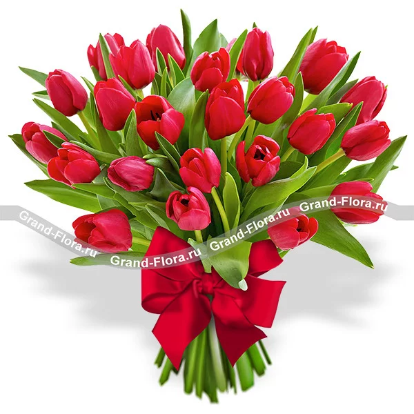 25 тюльпанов: тюльпаны красные - 25 шт, бант красный.