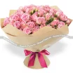 (на фото) роза кустовая розовая - 15 шт, упаковка, лента розовая. Примерный размер: 35Х35 см.
