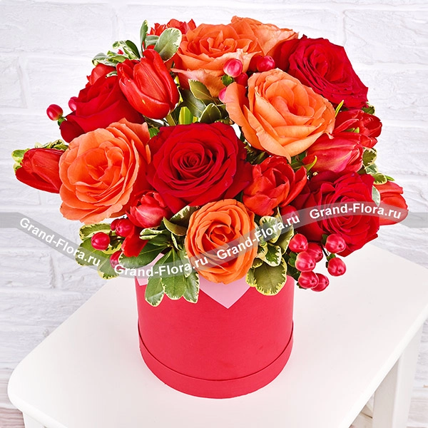Букет выполнен из красных роз сорта Гран При и страстных красных тюльпанов, что в целом делает композицию насыщенной и притягательной,мягким дополнением становятся персиковые розы, а так же изящная стильная коробка в тон. Композиция имеет высоту от 25 см, а диаметр от 20 см до 35 см, в зависимости от выбранного варианта. Обращаем Ваше внимание, что состав и оформление букета могут отличаться.