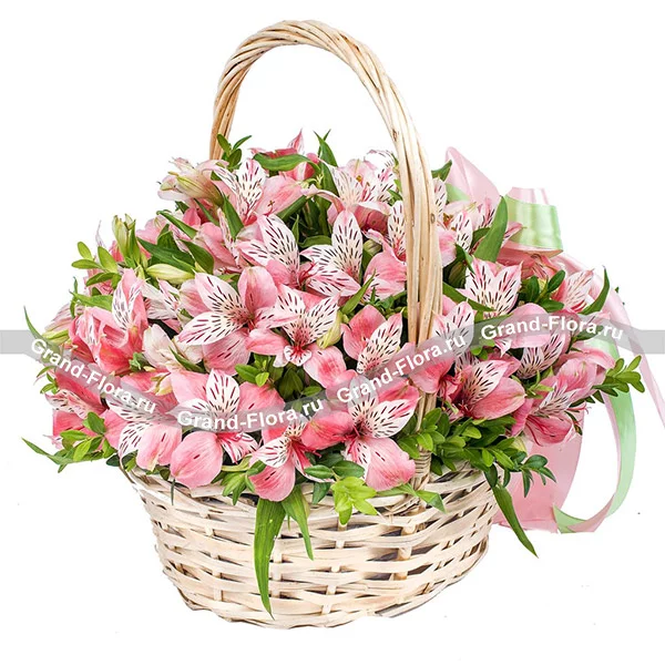 Люкс: альстромерия розовая -25 шт., оазис, корзина, лента