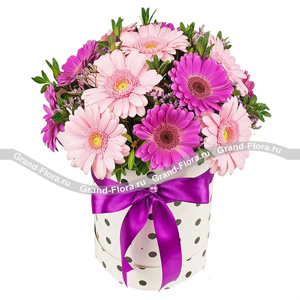 Стандартный: гербера малиновая - 10 шт., гербера розовая - 9 шт., декоративная зелень, коробка (цвет и форма могут отличаться от изображения), лента.