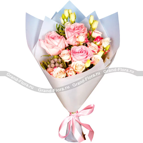 Рассмотрите эту цветочную композицию из классических и кустовых роз с эустомой. Легкий, ненавязчивый, стильный!