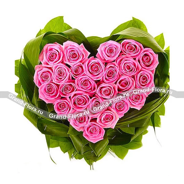 ДЕЛЮКС: роза розовая - 25 шт., декоративная зелень, оазис сердце.